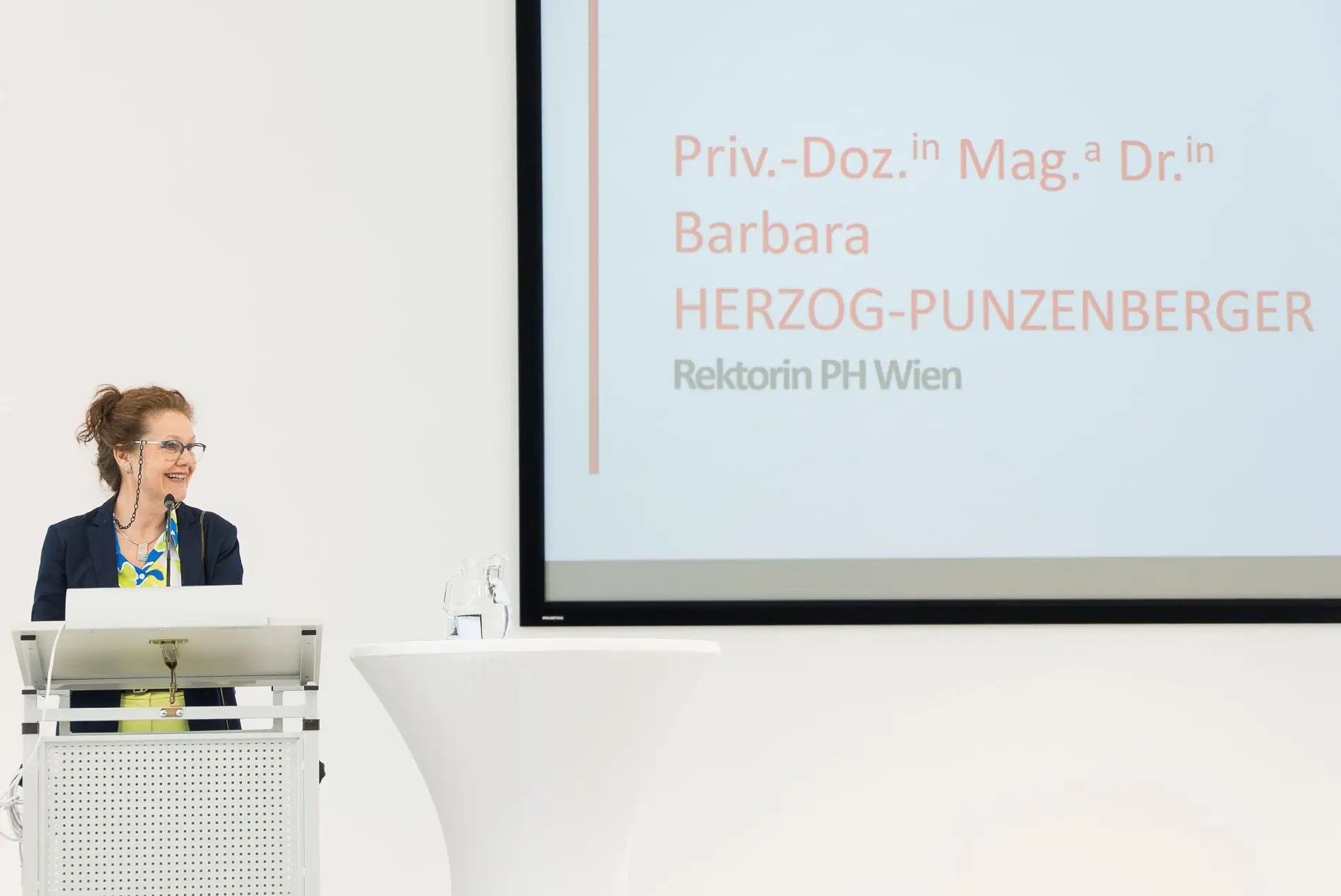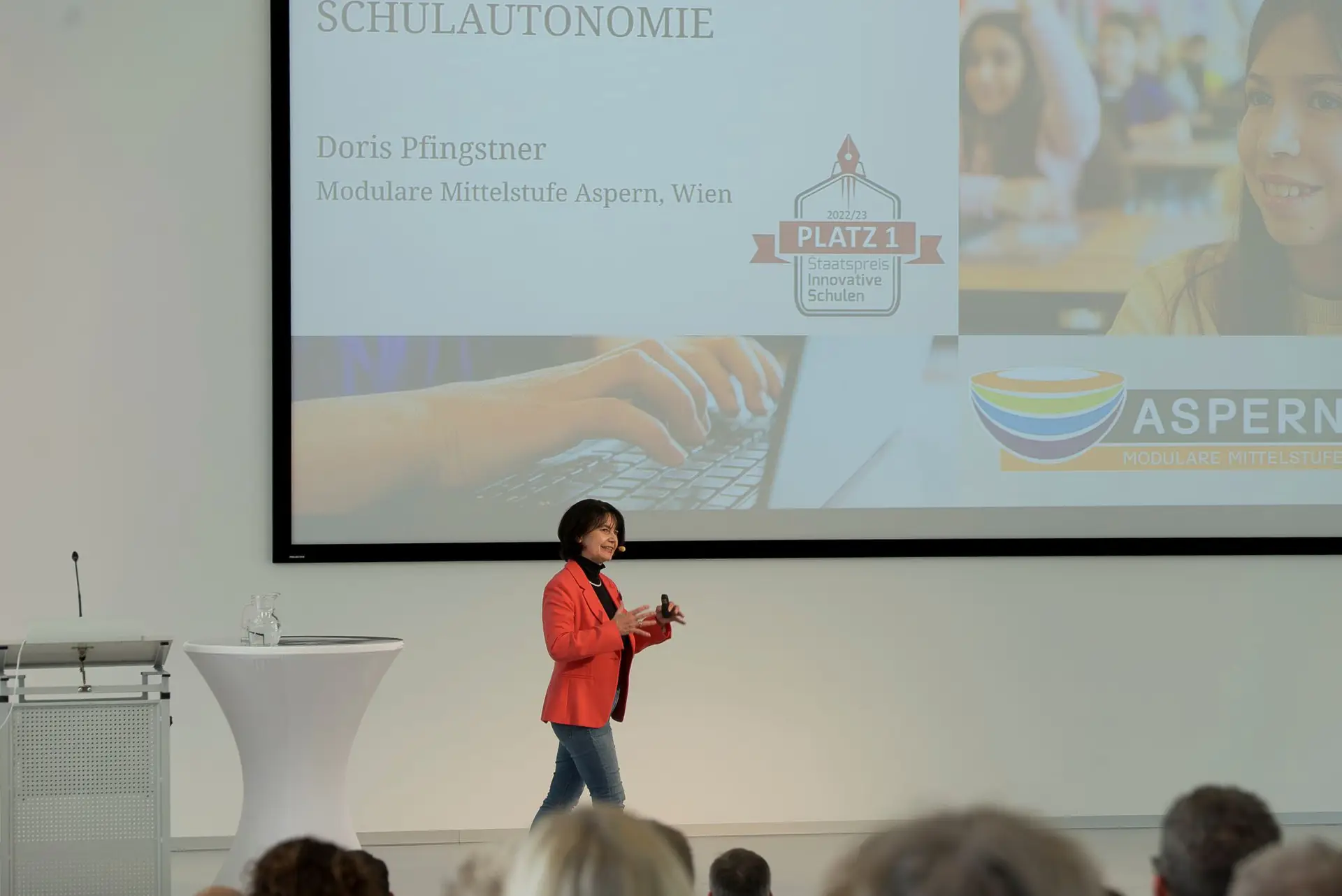Nach der Eröffnung durch Rektorin Barbara Herzog-Punzenberger und einer Videobotschaft von Vizebürgermeisterin Bettina Emmerling setzte Doris Pfingstner von der Modularen Mittelstufe Aspern mit ihrer Keynote „Mehr Mut zur Schulautonomie“ einen deutlichen Impuls. Sie sprach sich für größere Entscheidungsfreiheit an Schulen aus – etwa bei der Auswahl digitaler Tools, Lernformaten oder Kooperationspartner – und zeigte auf, wie Autonomie Innovation stärken kann.