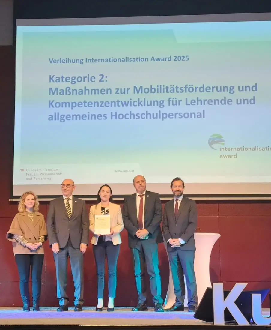 Im Rahmen der OeAD-Hochschultagung 2025, die am 26. und 27. November an der FH Kufstein Tirol stattfand und sich dem Zusammenspiel von Hochschule und Arbeitswelt im internationalen Kontext widmete, wurden die diesjährigen Internationalisation Awards verliehen. Der Award wird gemeinsam vom Bundesministerium für Bildung, Wissenschaft und Forschung (BMFWF) und dem OeAD vergeben und zeichnet Beispiele guter Praxis zur Umsetzung der Hochschulmobilitäts- und Internationalisierungsstrategie 2030 (HMIS2030) aus.