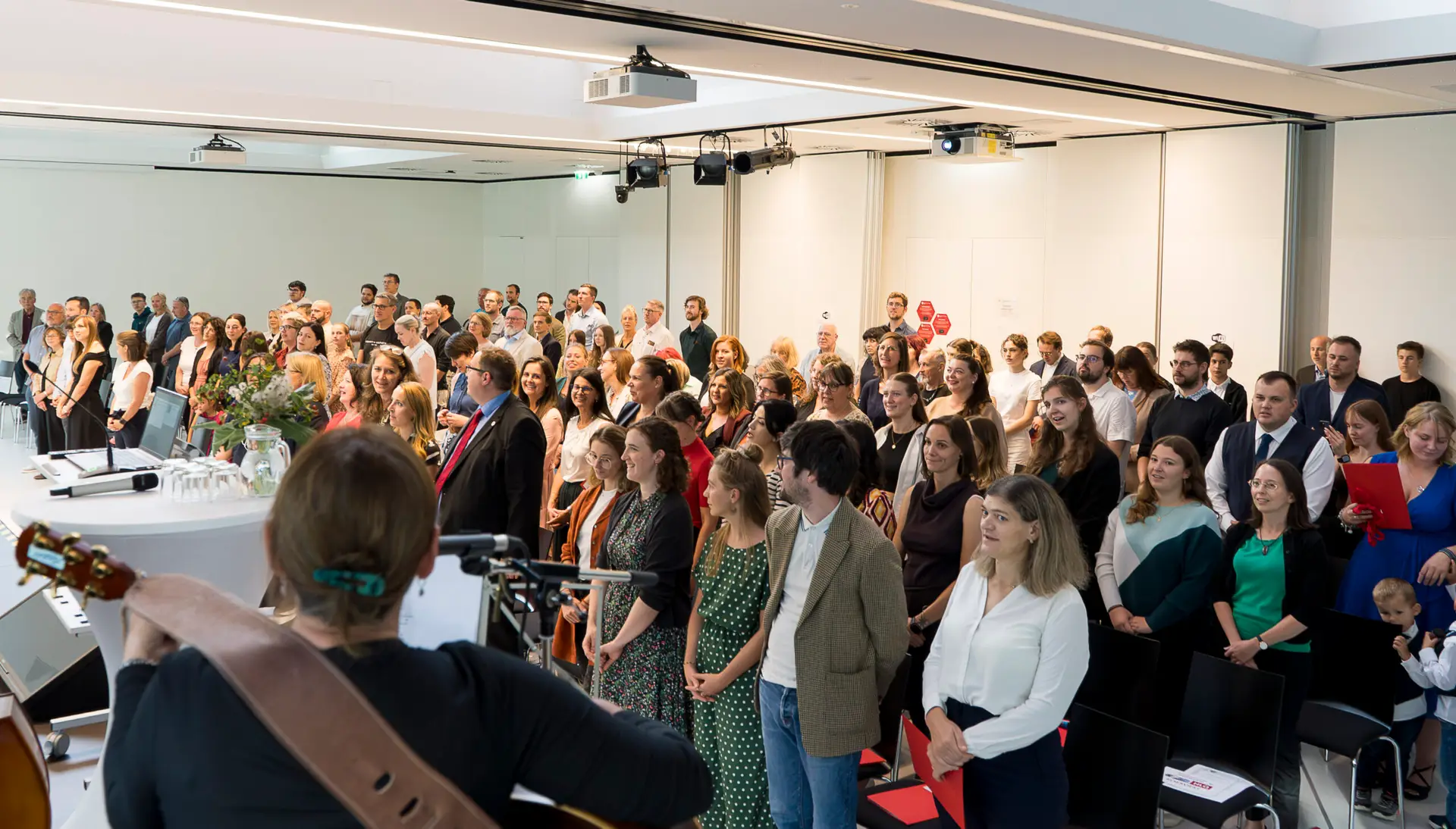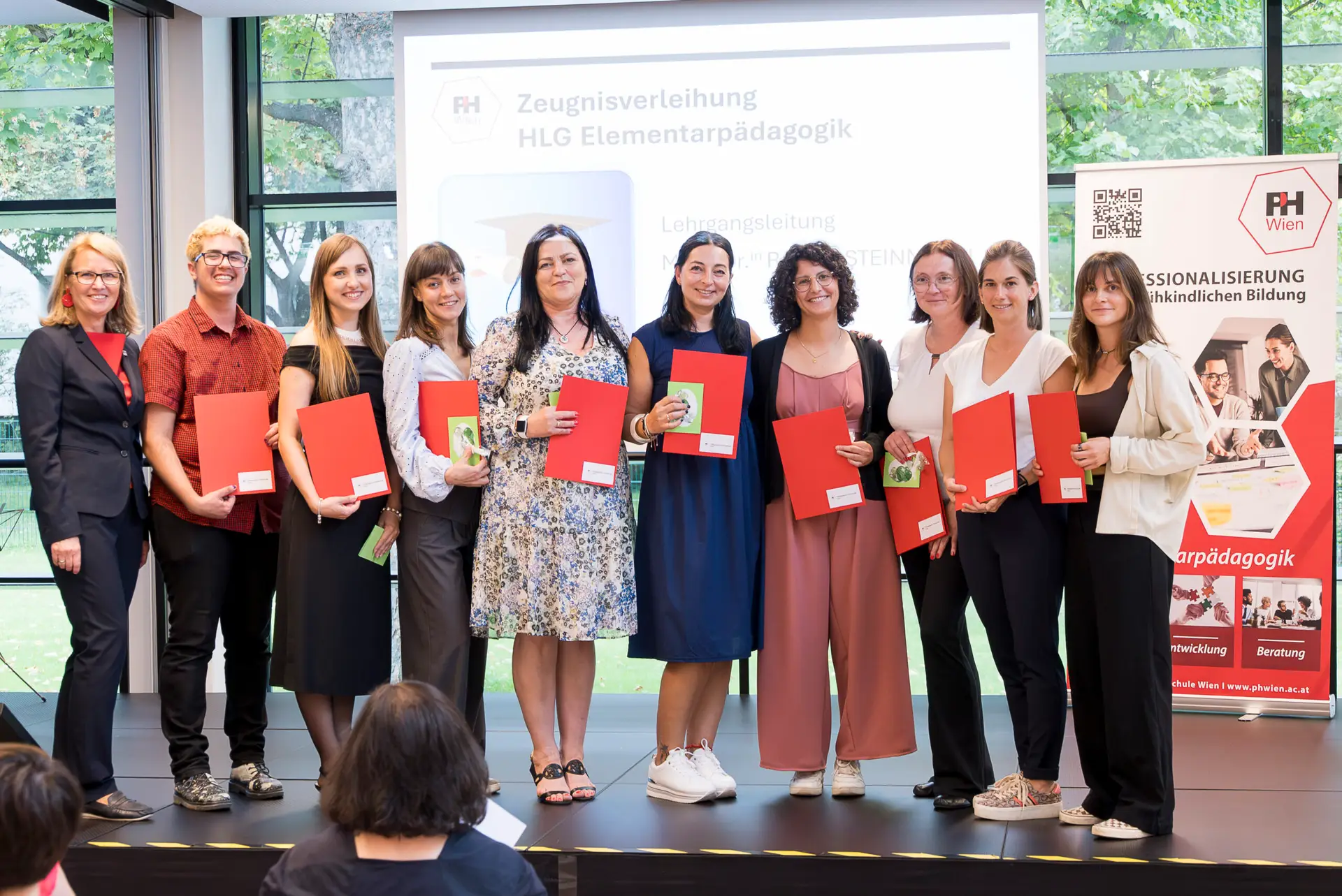 Am Dienstag, dem 12. September 2025, fand im Hedy-Lamarr-Saal in Wien die feierliche Verabschiedung der 81 Absolvent:innen der Hochschullehrgänge „Inklusive Elementarpädagogik“, „Elementarpädagogik“, „Quereinstieg Elementarpädagogik“ sowie „Mentoring in der Elementarpädagogik“ statt. Rund 300 Gäste folgten der Einladung und machten die Veranstaltung zu einem eindrucksvollen Zeichen der Wertschätzung und Anerkennung für die pädagogische Arbeit im frühkindlichen Bereich. Musikalisch begleitet wurde der Festakt von Pina und Band, die dem Abend eine stimmungsvolle Note verliehen.