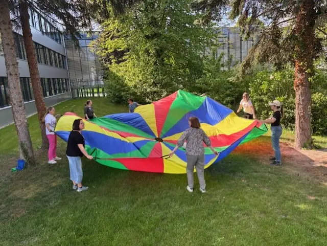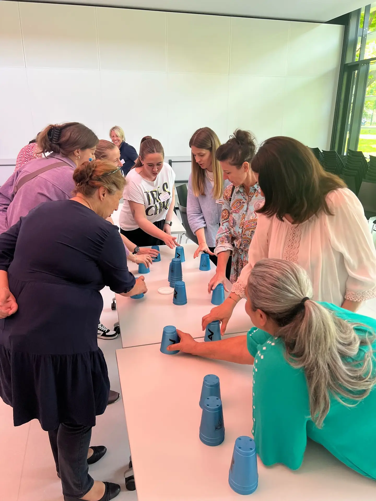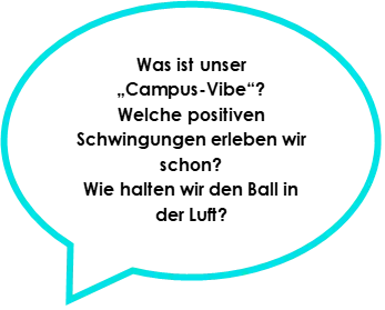 Anschließend führten die Pädagogen*innen gemeinsam mit ihren Leitungen einen Bewegungsparcours durch. Dieser Parcours war nicht nur eine körperliche Herausforderung, sondern stand auch in Verbindung mit Reflexionen in den Campusteams zu gesundheitsförderlichen Aspekten, z.B. “Was ist unser „Campus-Vibe“? Welche positiven Schwingungen erleben wir schon? Wie halten wir gemeinsam den Ball in der Luft?”