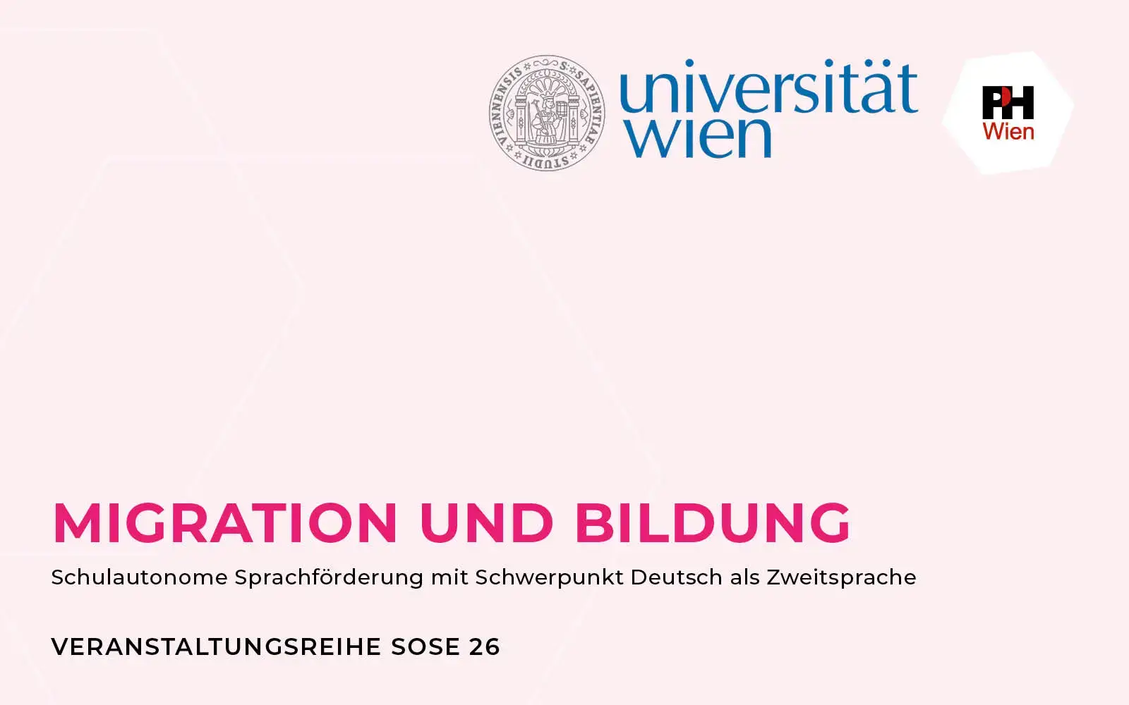 Die Schulen in Österreich werden im Hinblick auf die Organisation der Deutschvermittlung und -förderung eine größere Autonomie bekommen als bisher. Im Sinne einer Begleitung dieser Entwicklungen wird von der PH Wien und der Universität Wien die Veranstaltungsreihe „Migration und Bildung – Schulautonome Sprachförderung mit Schwerpunkt Deutsch als Zweitsprache“ organisiert, zu der Sie und andere Interessierte herzlich eingeladen sind. Das Programm umfasst Fachbeiträge zu verschiedenen Themenschwerpunkten und gestaltet sich wie folgt: