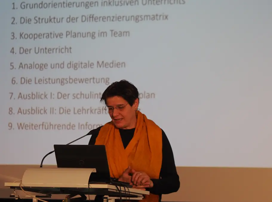 Zur Einstimmung auf das Tagungsthema begann die Veranstaltung mit dem Vortrag von Ada Sasse, Humboldt-Universität Berlin, zum Thema „Inklusiven Unterricht planen, gestalten und reflektieren: Die Differenzierungsmatrix in Theorie und Praxis.“ Neben der Grundorientierung eines inklusiven Unterrichts, der kooperativen Planung im Team und der konkreten Umsetzung folgten zahlreiche Ausführungen aus ihrer praktischen Erfahrung mit Lehrer*innen, ihrer Zusammenarbeit mit Schulen und über die wichtige Rolle der Schulentwicklung.