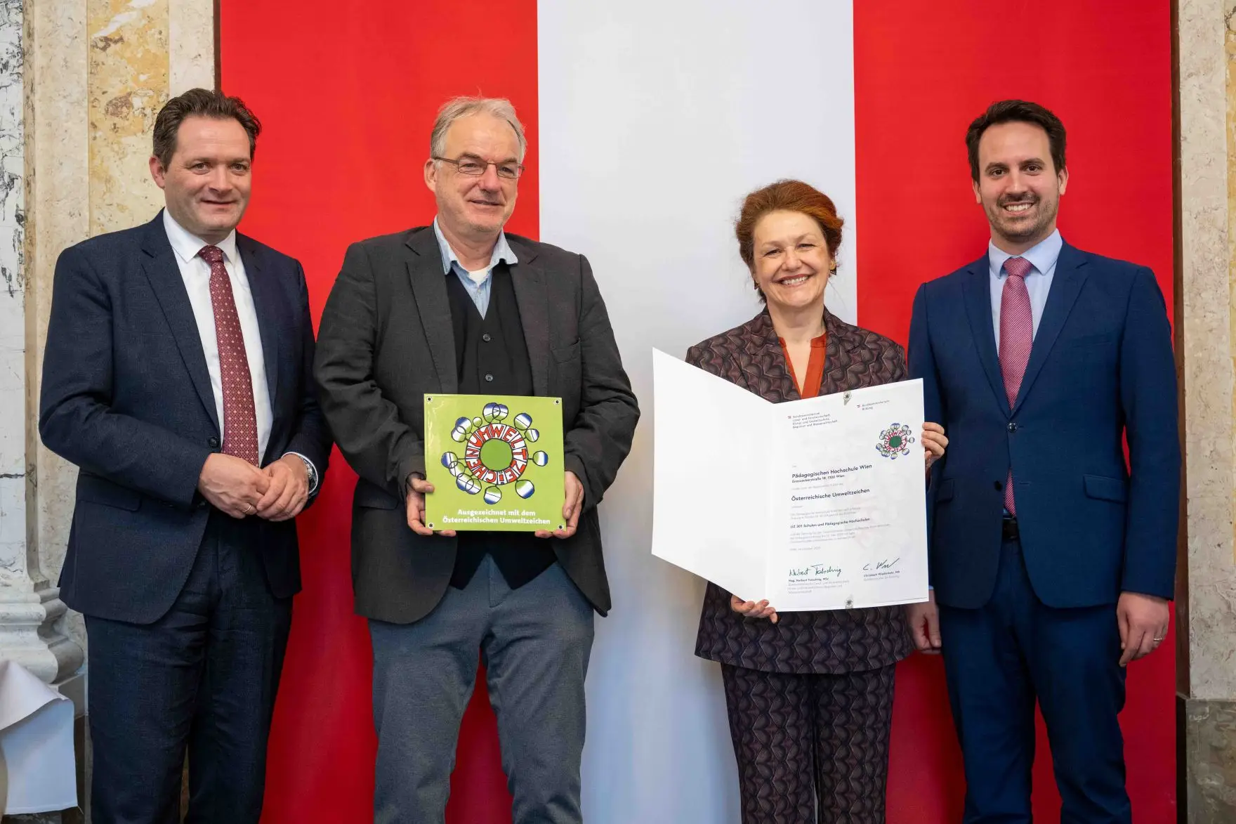 Die Pädagogische Hochschule Wien wurde mit dem Österreichischen Umweltzeichen für Bildungseinrichtungen ausgezeichnet. Rektorin Barbara Herzog-Punzenberger und Nachhaltigkeitsbeauftragter Florian Sobanski nahmen die Auszeichnung am 22. Oktober 2025 im Rahmen einer feierlichen Verleihung im Marmorsaal des Bundesministeriums für Land- und Forstwirtschaft, Umwelt und Klimaschutz (BMLUK) entgegen.