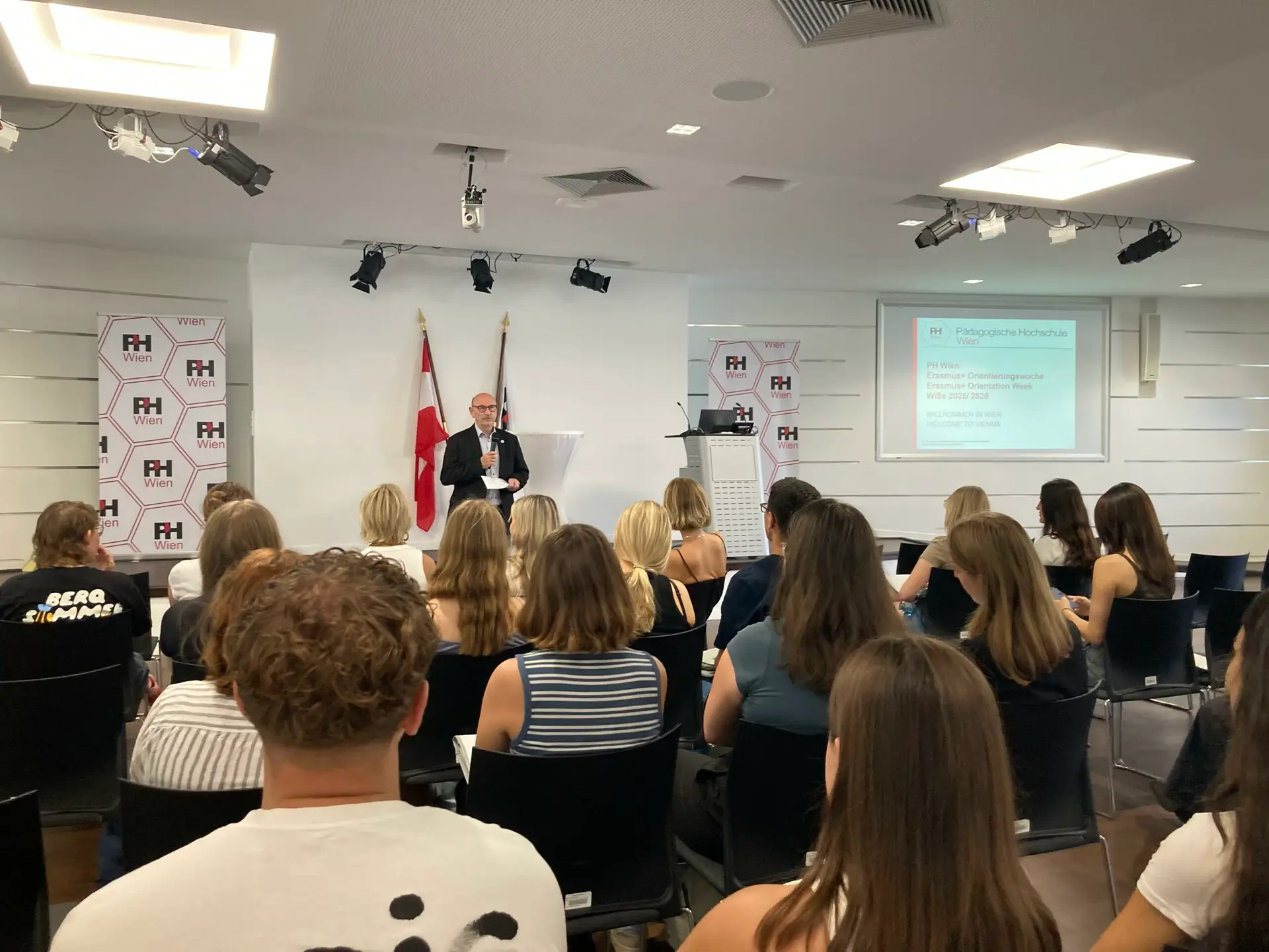 Nach der Registrierung mit Formalitäten, Goodies und Geschenken erfolgte der offizielle Empfang im Festsaal in einer festlichen Ansprache durch Herrn Vizerektor HS-Prof. Mag. Dr. Norbert Kraker und den Leiter des Z:INT HS-Prof. Mag. Dr. Thomas Bauer, BEd.. Danach erhielten die neuen Incoming Students wichtige Infos in der Welcome Präsentation, gefolgt von einer Führung durch das gesamte Areal der PH Wien.