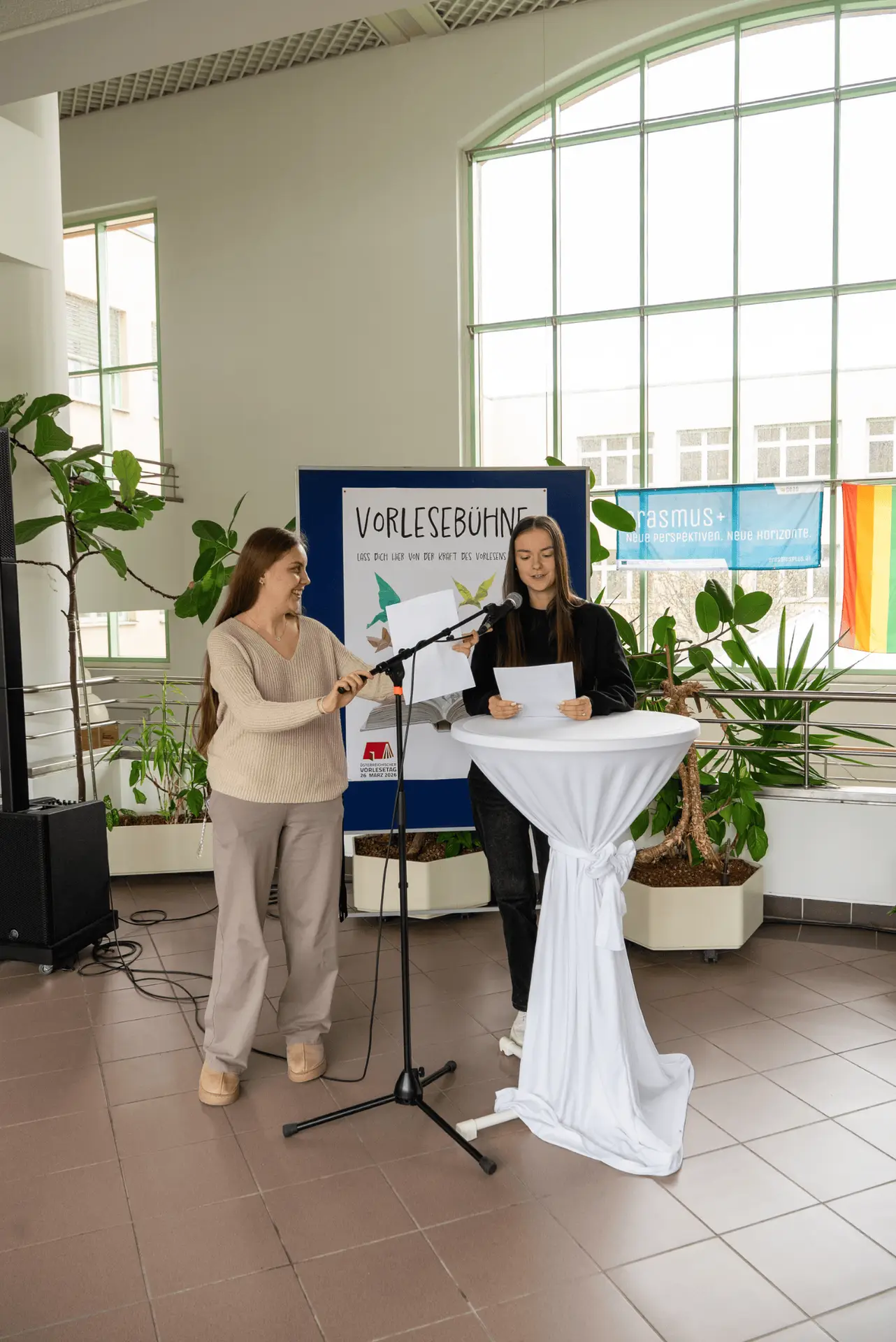 Den Auftakt bildete ein campusweiter Vorlese‑Flashmob, bei dem der Alltag kurz innehielt und überall gelesen wurde. Anschließend luden mehrere Vorlesebühnen im Haus – als „Speakers Corner“ gestaltet – zum Mitmachen ein. In Haus 1, Haus 4 und in den Praxisschulen wurde vorgelesen und aufmerksam gelauscht. Besonders eindrucksvoll waren die Beiträge der Schülerinnen und Schüler der Praxisvolksschule und Praxismittelschule, die mutig ans Mikrofon traten und Texte präsentierten. Mehr zum Beitrag der Praxisvolkschule zum Österreichischen Vorlesetag auch hier.