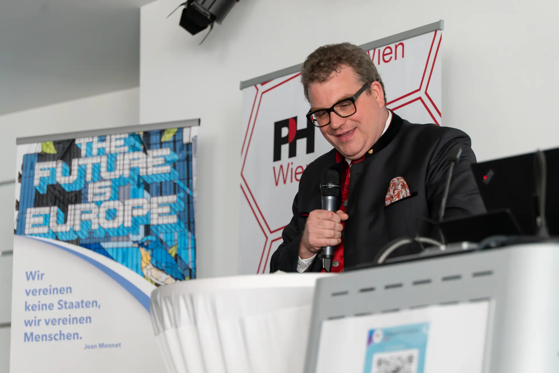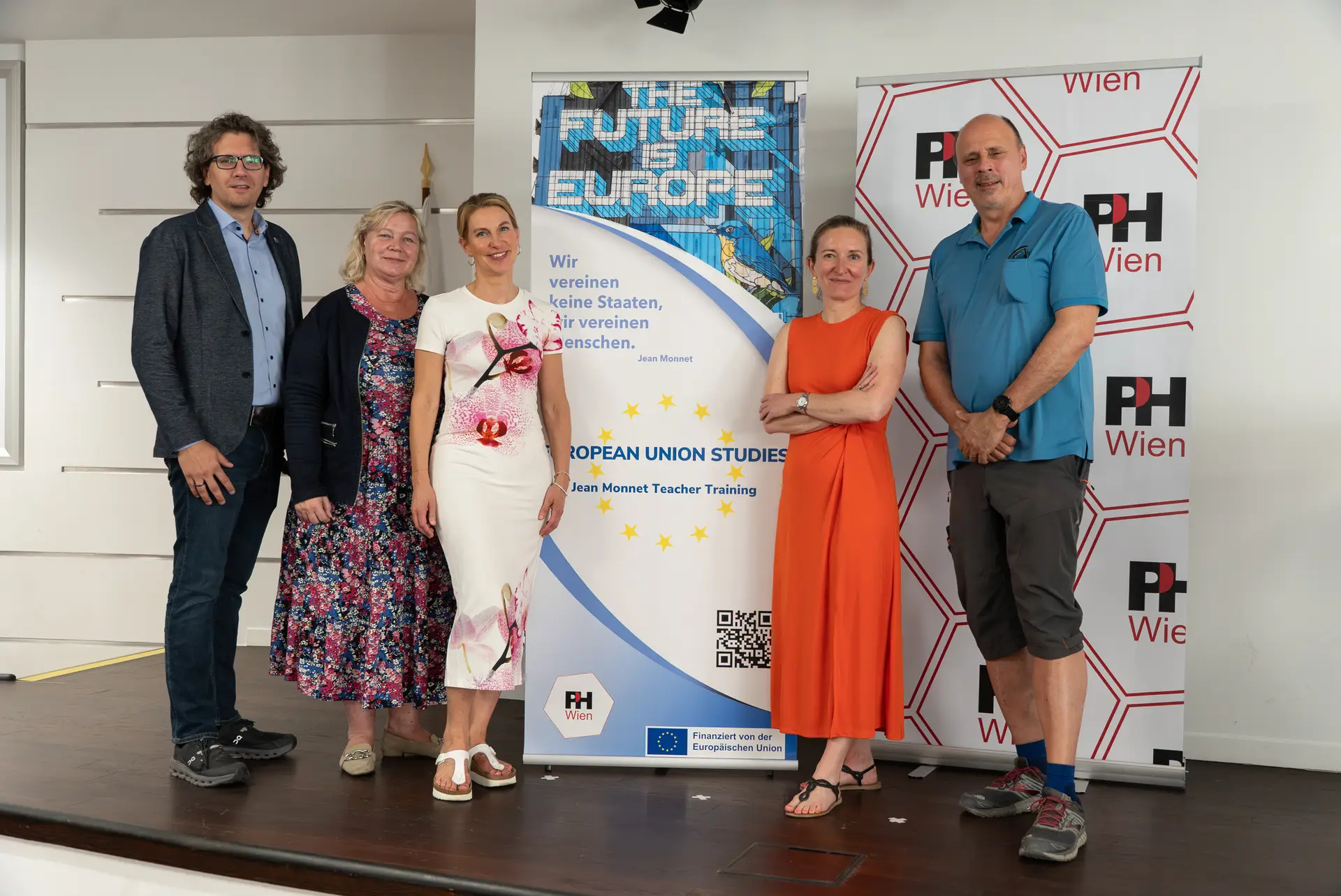 Am 13. Juni 2025 fand an der Pädagogischen Hochschule Wien die feierliche Abschlussveranstaltung des Erasmus+-Projekts European Union Studies – Jean Monnet Teacher Training statt. Nach der herzlichen Begrüßung durch die Rektorin der PH Wien, Priv.-Doz.in Mag.a Dr.in Barbara Herzog-Punzenberger, wurde in einer Schweigeminute der Opfer des Amoklaufs in Graz gedacht.