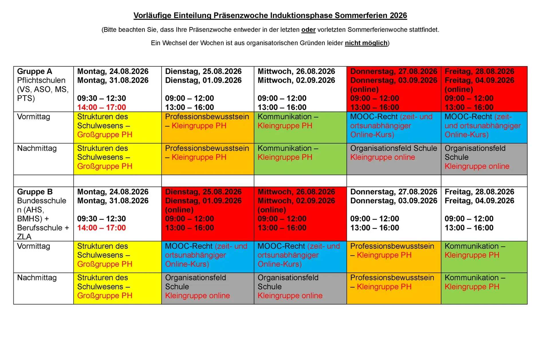 Alle Neulehrer:innen, die bei der Bildungsdirektion Wien mit Schulbeginn 2026 angestellt werden und die vom Dienstgeber den Besuch von 10 Tagen vorgeschrieben bekommen, absolvieren die Präsenzwoche im Zeitraum von 24.08.2026 – 28.08.2026: