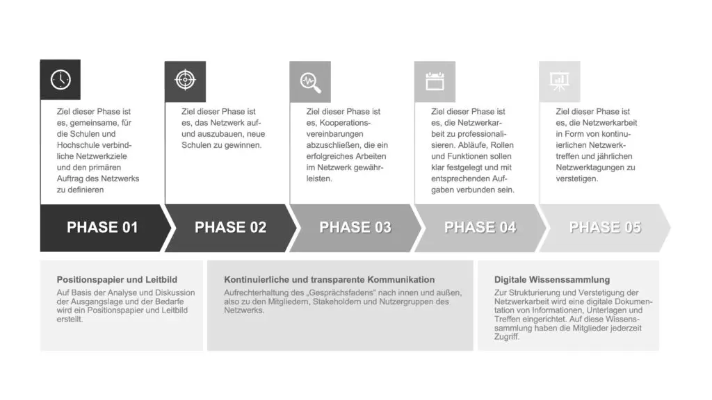 Das Partnerschulen-Netzwerk Berufsbildung der PH Wien hat sich in mehreren, aufeinander aufbauenden Phasen entwickelt. Der dargestellte Phasenverlauf zeigt, wie aus ersten Kontakt- und Austauschformaten (vgl. BarCamp 2023, 2024, 2025) schrittweise eine strukturierte und nachhaltige Netzwerkkooperation entstanden ist, in der gemeinsame Zielsetzungen, stabile Kooperationsformen und kontinuierliche Weiterentwicklung im Mittelpunkt stehen.