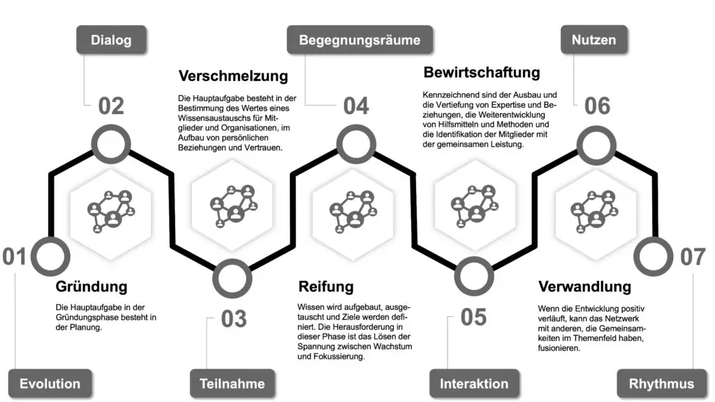 Das Partnerschulen-Netzwerk Berufsbildung der PH Wien orientiert sich an fünf Entwicklungsstufen und sieben zentralen Gestaltungsprinzipien einer Community of Practice. Die Grafik zeigt, wie sich die Zusammenarbeit im Netzwerk schrittweise entwickelt und durch gezielte Gestaltung langfristig stabilisiert und weitergeführt werden kann.